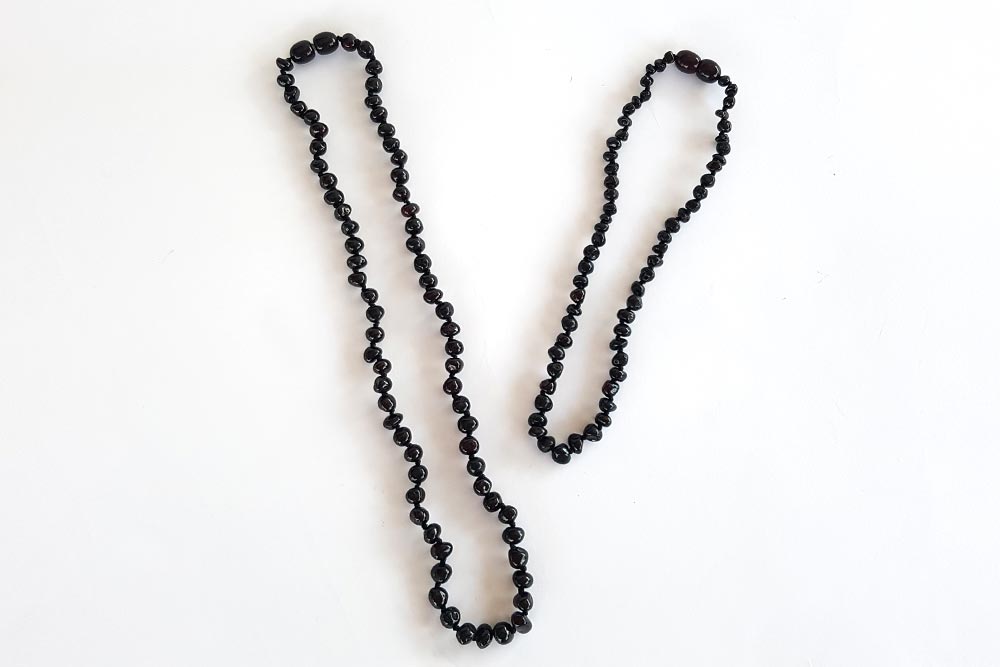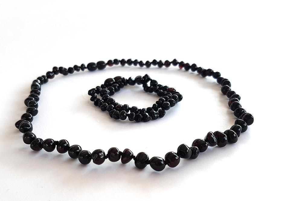 סט שרשראות משגעות בגוון דובדבן עמוק, שזורות מענברים עגולים לתינוק ולאמא.
